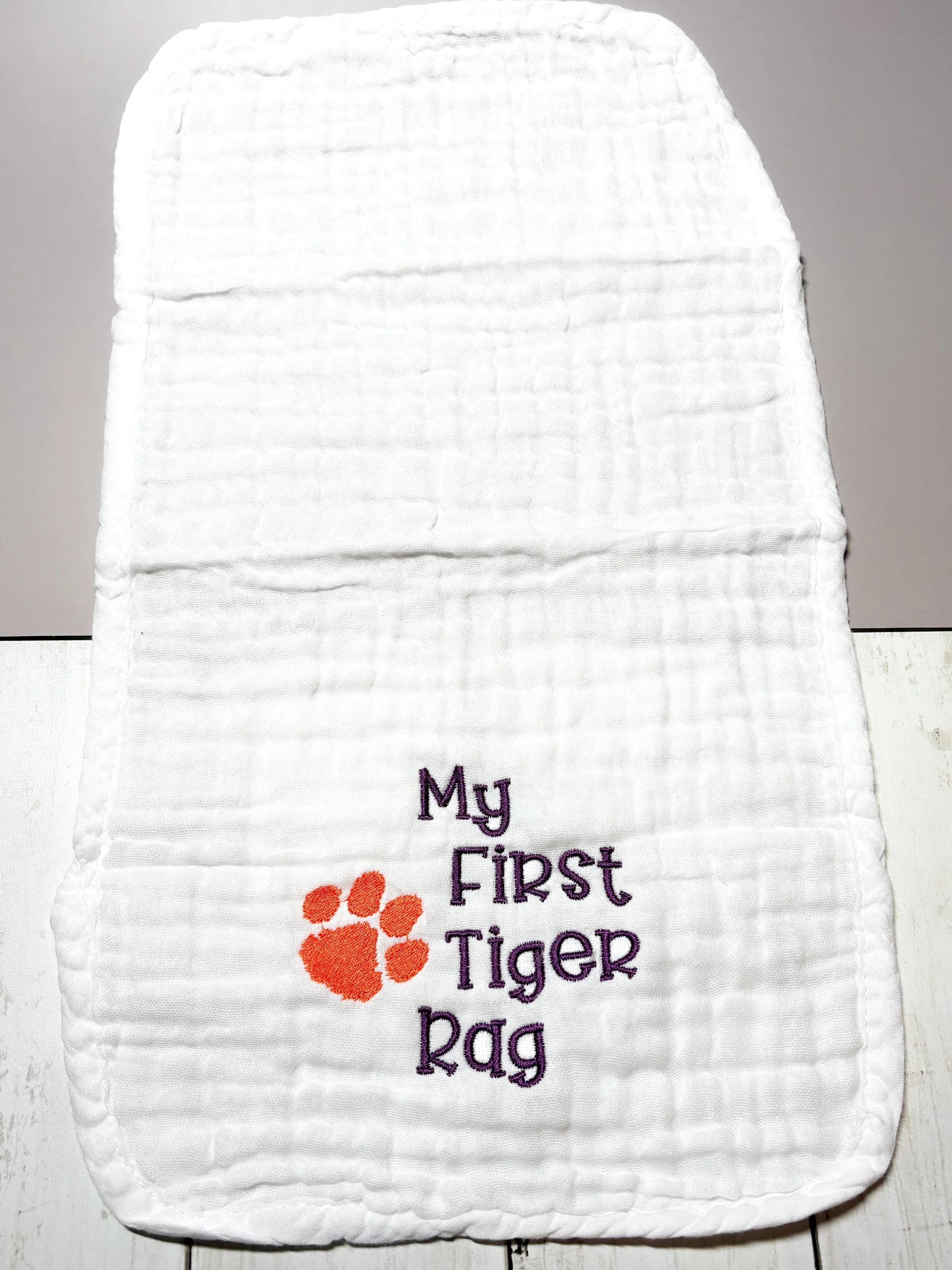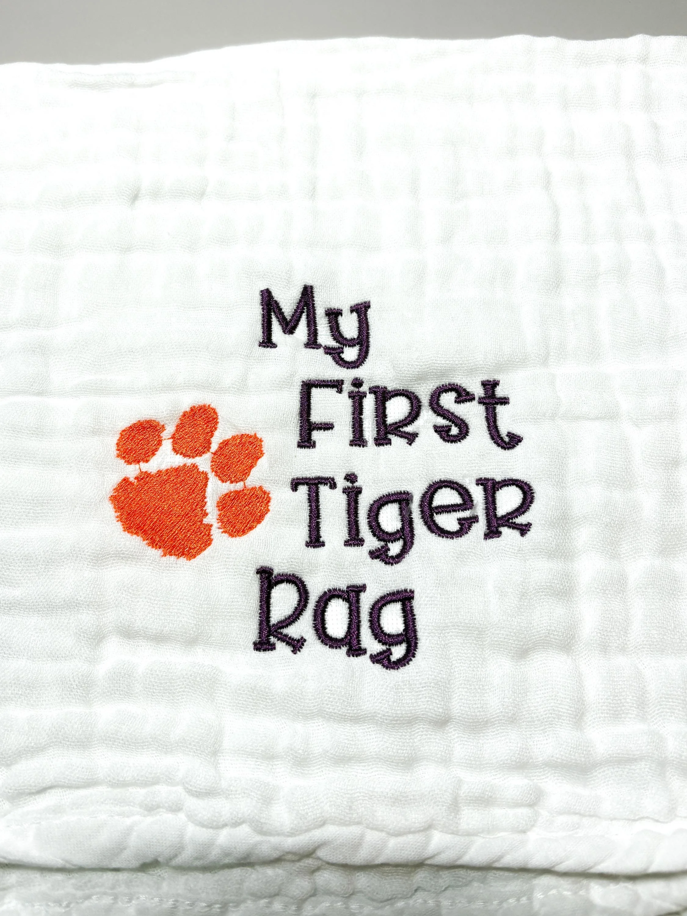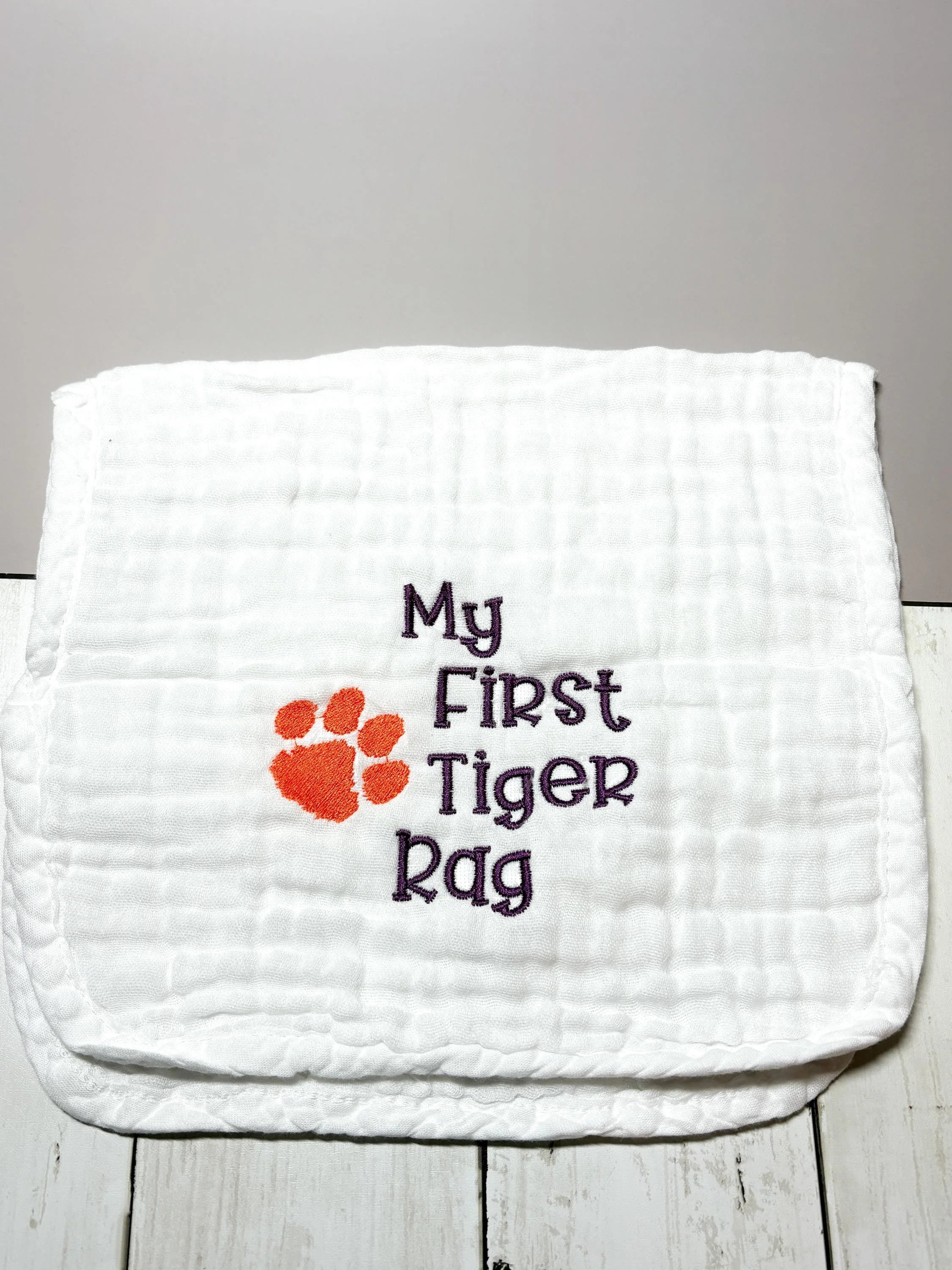 Welcome the newest Clemson fan! This soft embroidered burp cloth features the phrase “My First Tiger Rag” alongside a classic tiger paw, making it the perfect gift for Clemson-loving families. Whether you're celebrating a new baby, planning a Clemson-themed baby shower, or simply raising the next Tiger fan, this burp cloth is a fun and practical keepsake. Each burp cloth is professionally embroidered in my South Carolina studio.