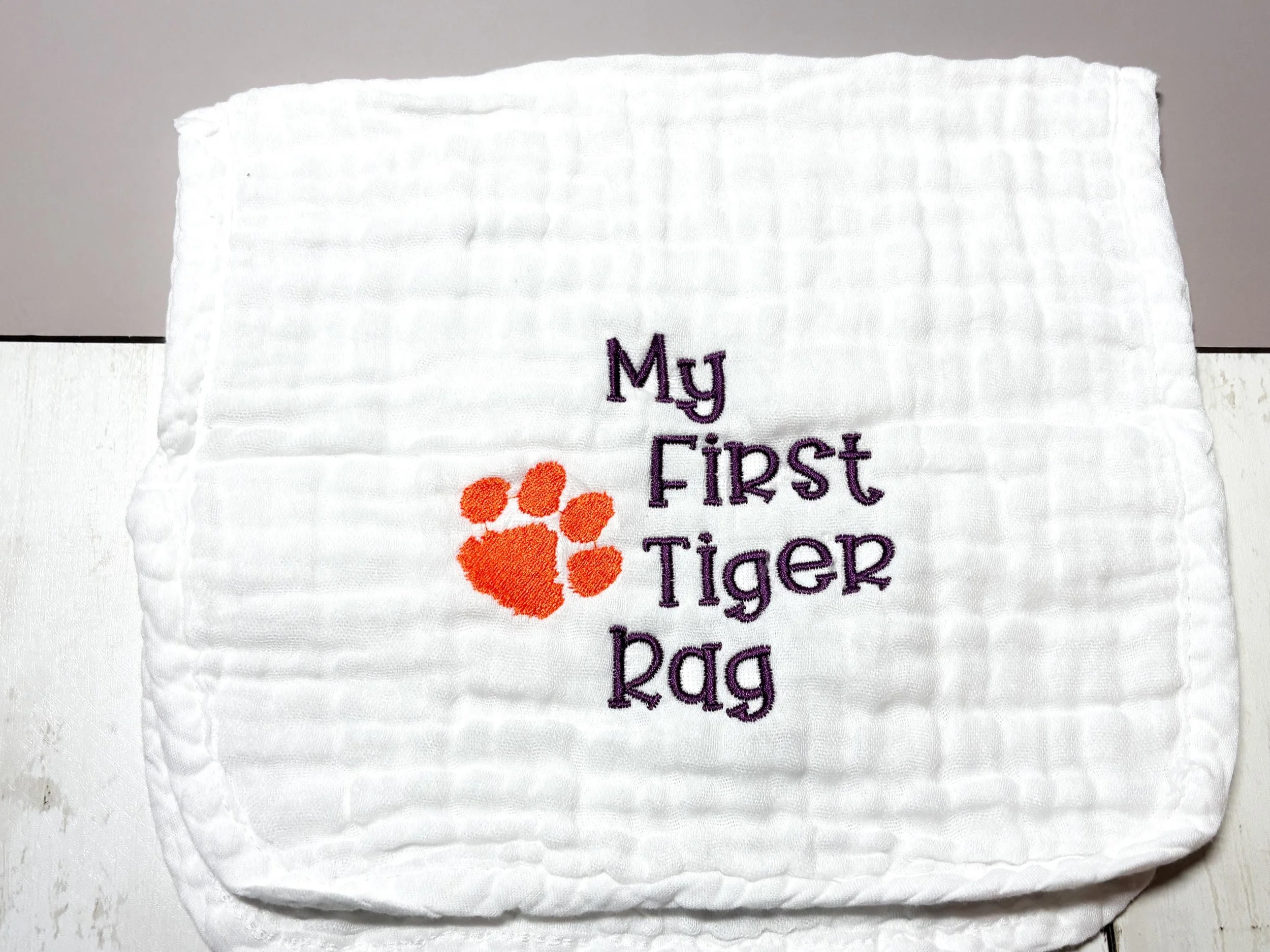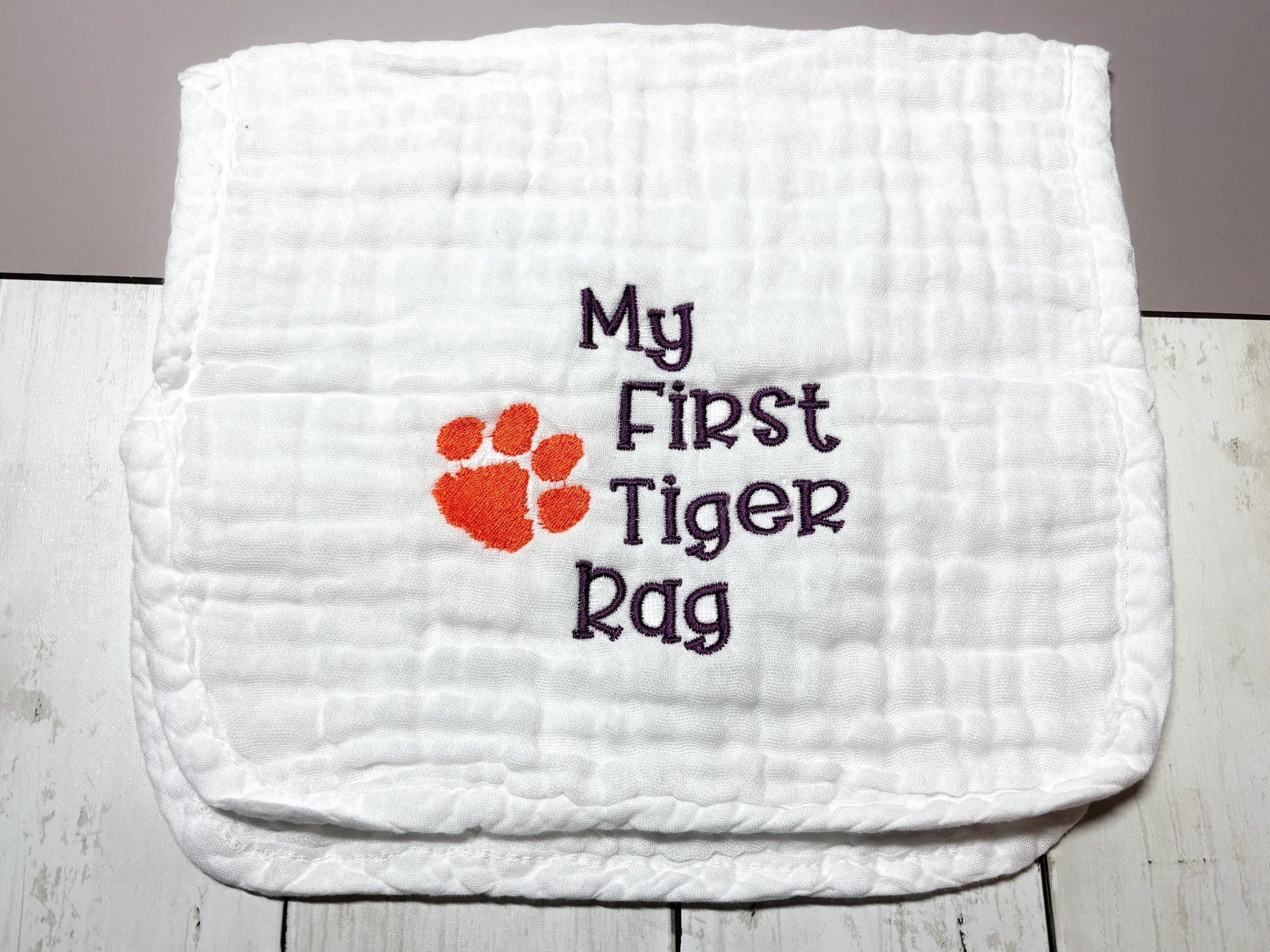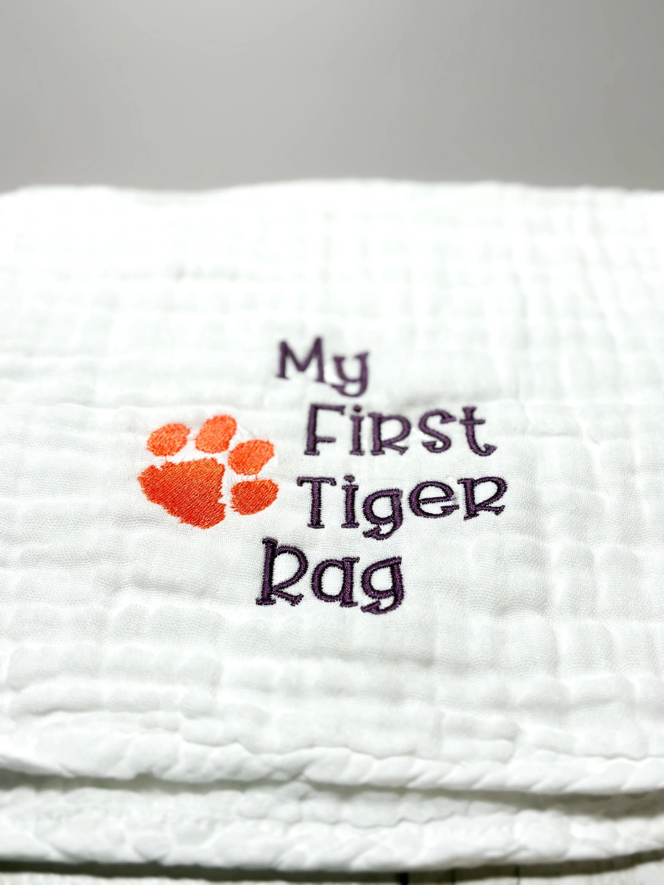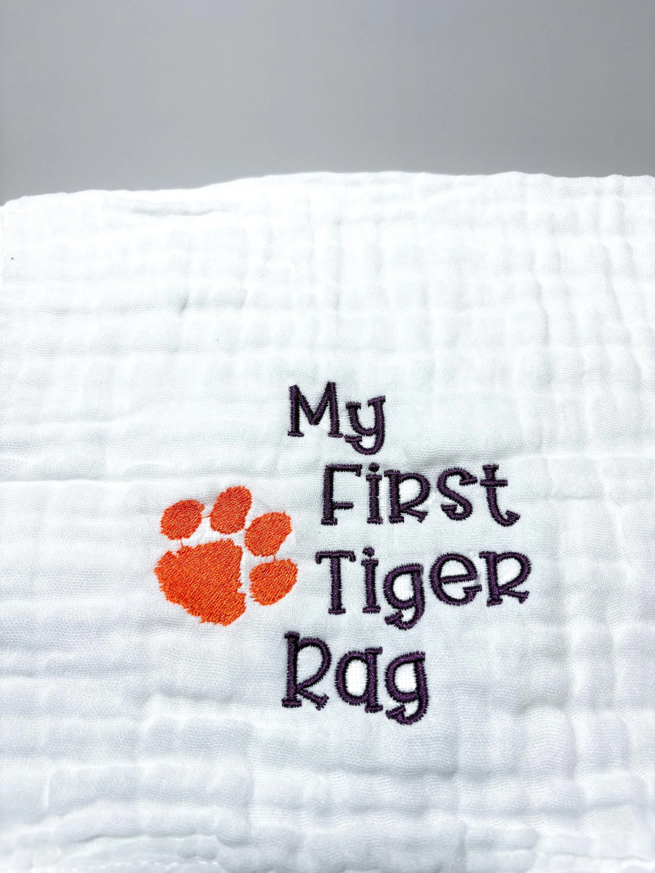 Welcome the newest Clemson fan! This soft embroidered burp cloth features the phrase “My First Tiger Rag” alongside a classic tiger paw, making it the perfect gift for Clemson-loving families. Whether you're celebrating a new baby, planning a Clemson-themed baby shower, or simply raising the next Tiger fan, this burp cloth is a fun and practical keepsake. Each burp cloth is professionally embroidered in my South Carolina studio.