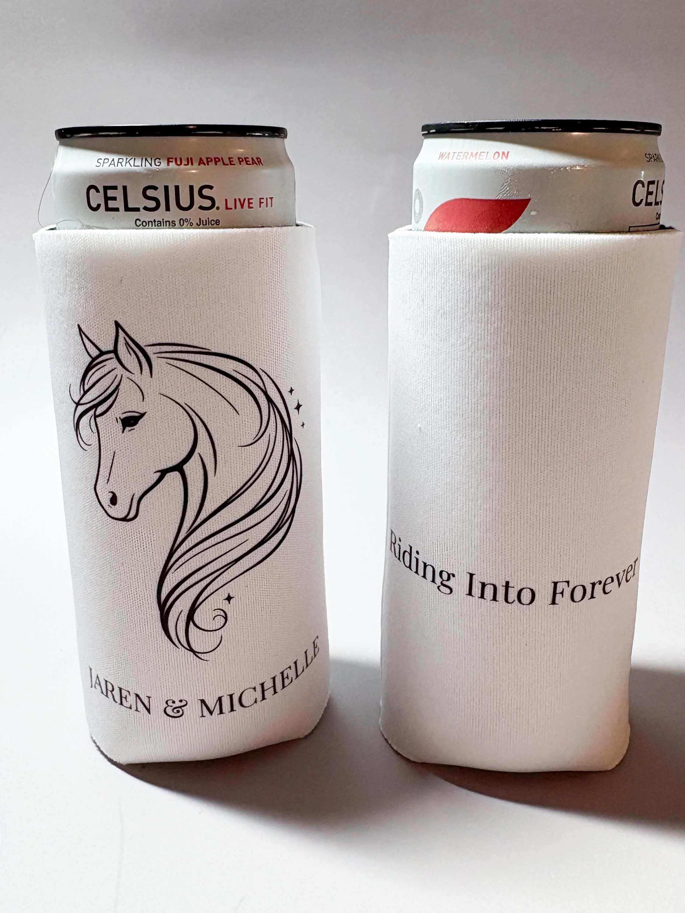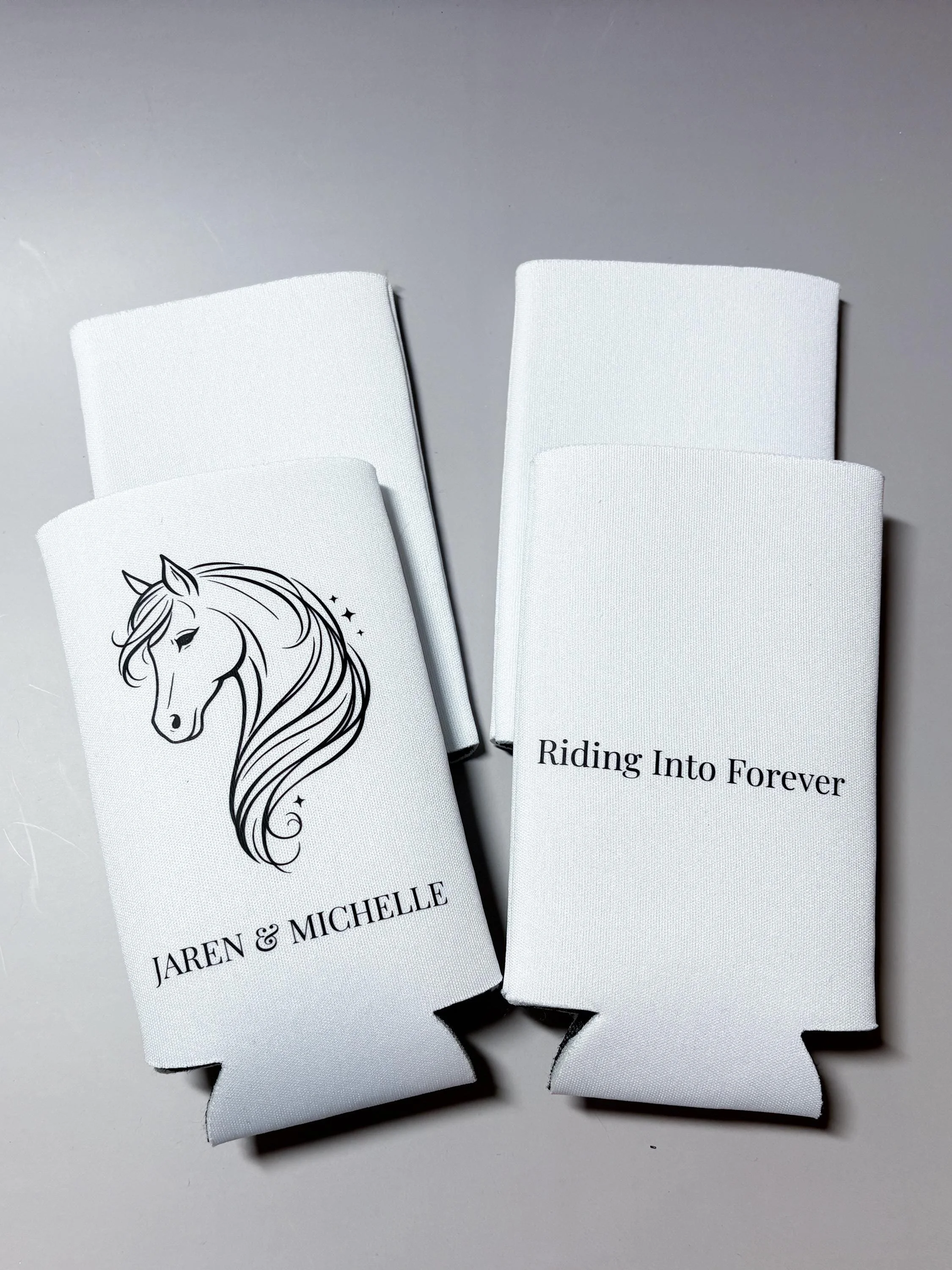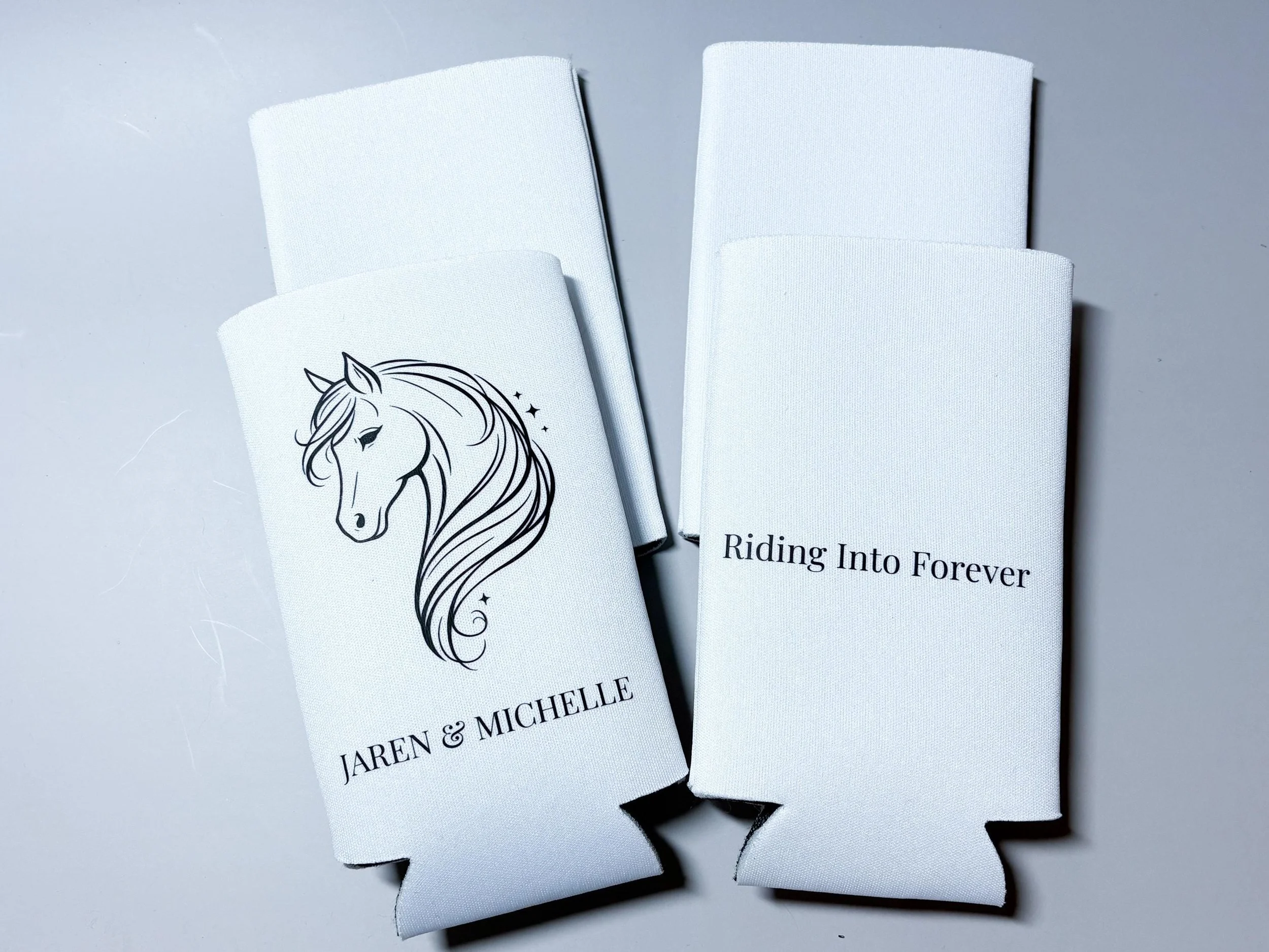 Personalized with your names and wedding date, these koozies are a unique and meaningful addition to your wedding day β especially for barn weddings, rustic venues, or horse-themed celebrations.