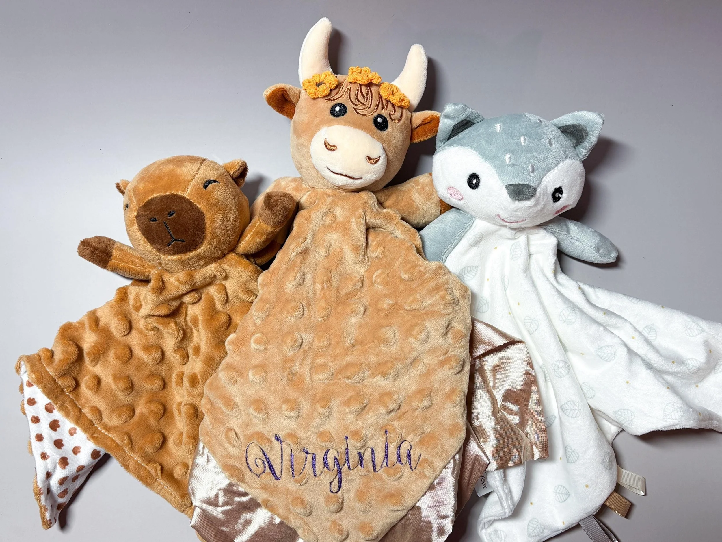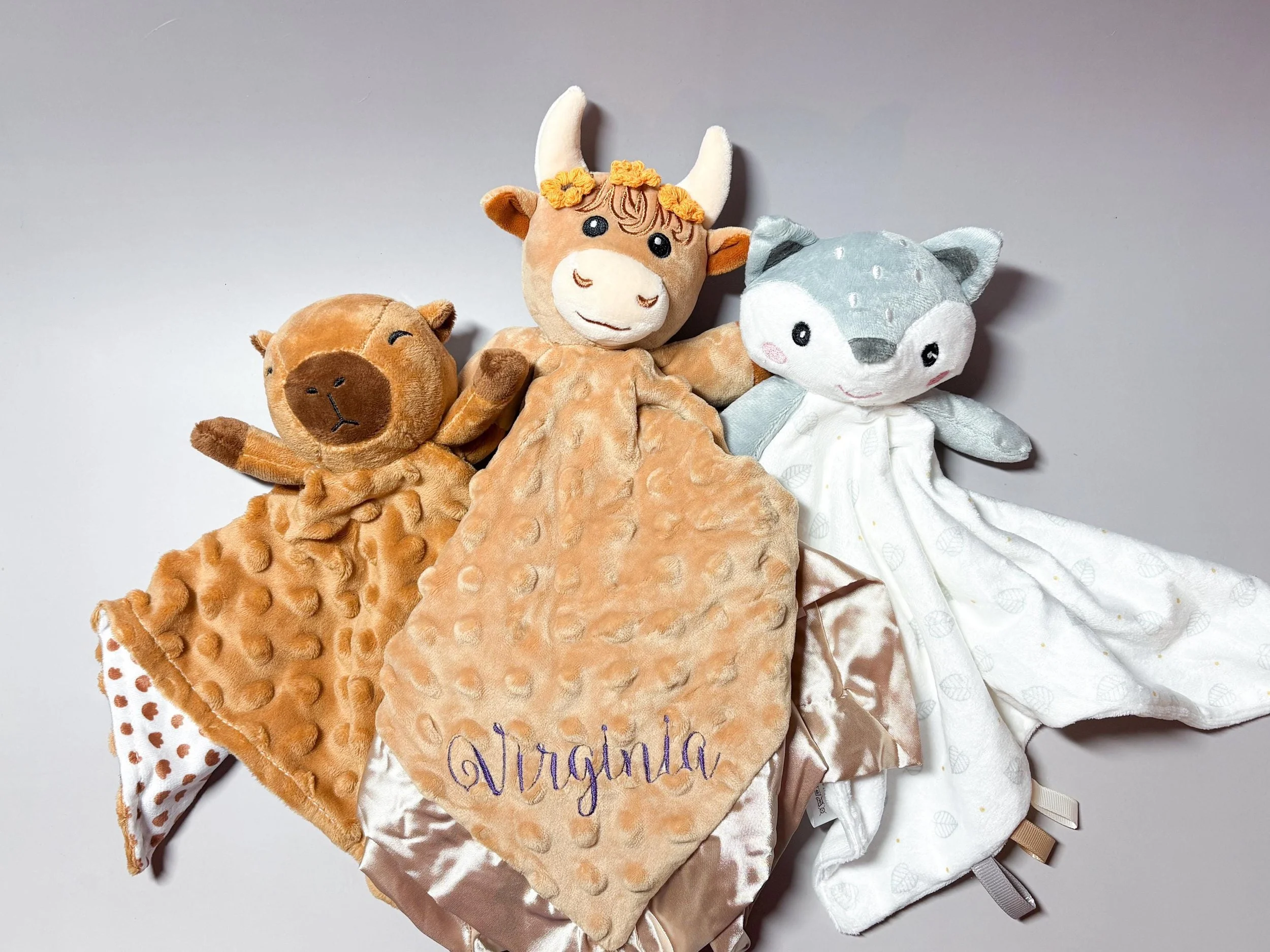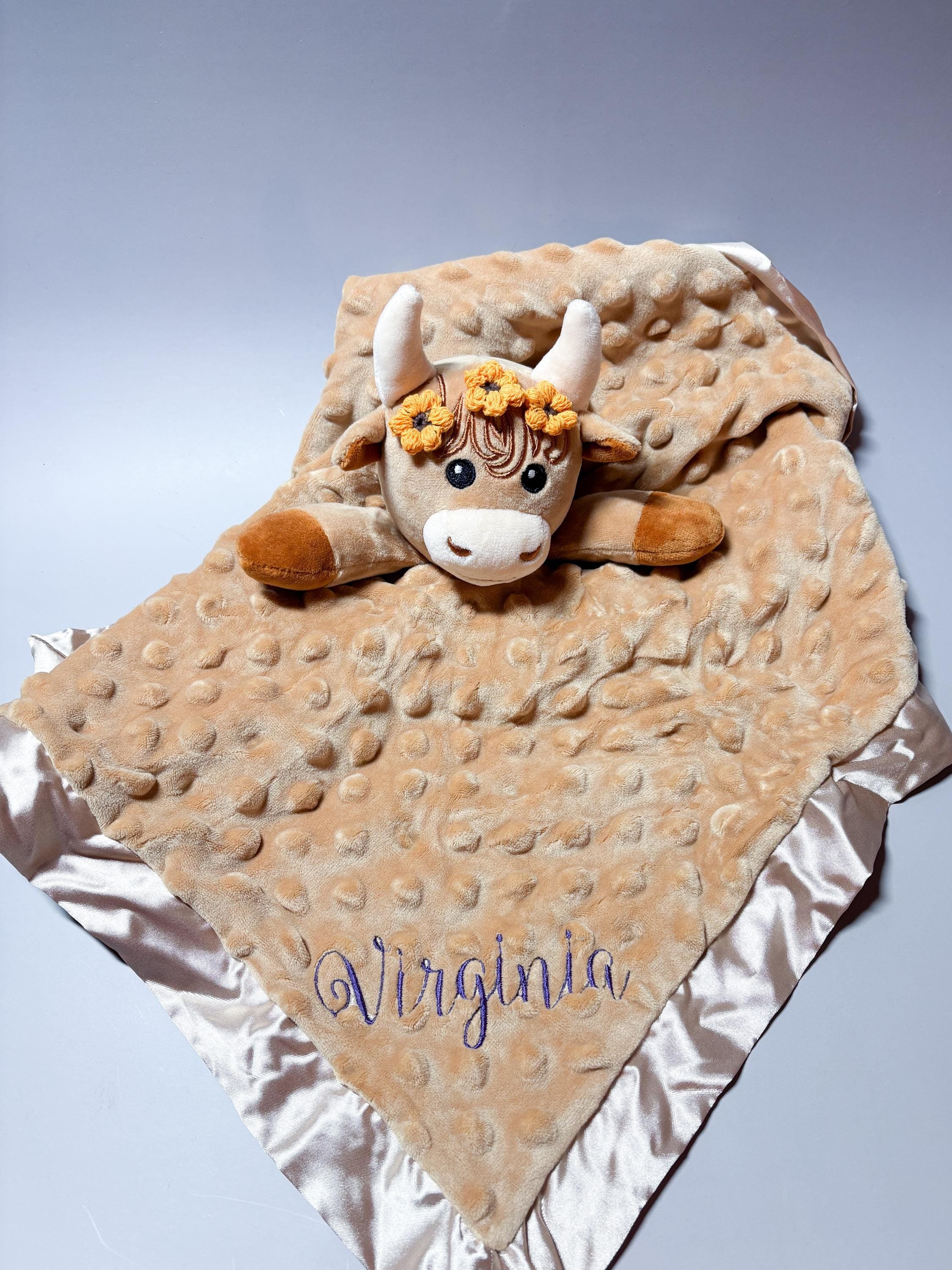 Personalized Baby Lovey Custom Name Security Blanket Plush Animal Lovey Fox, Highland Cow, Capybara Baby Shower Gift Newborn Gift