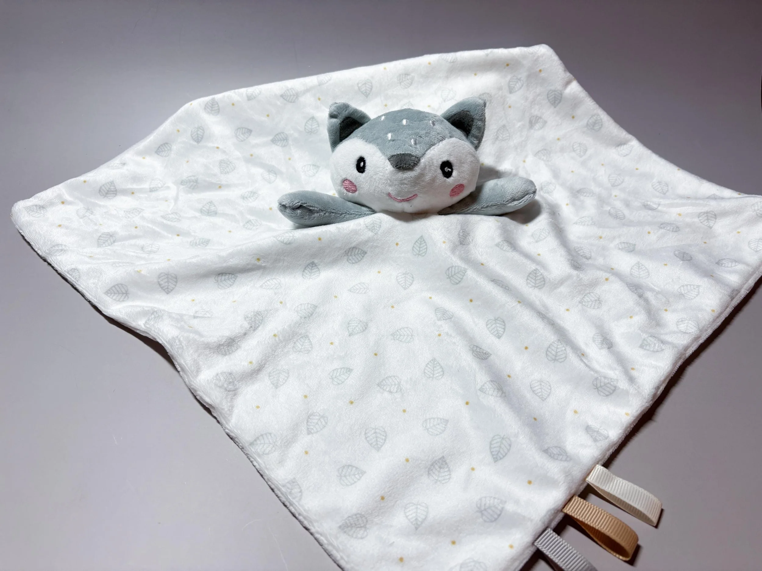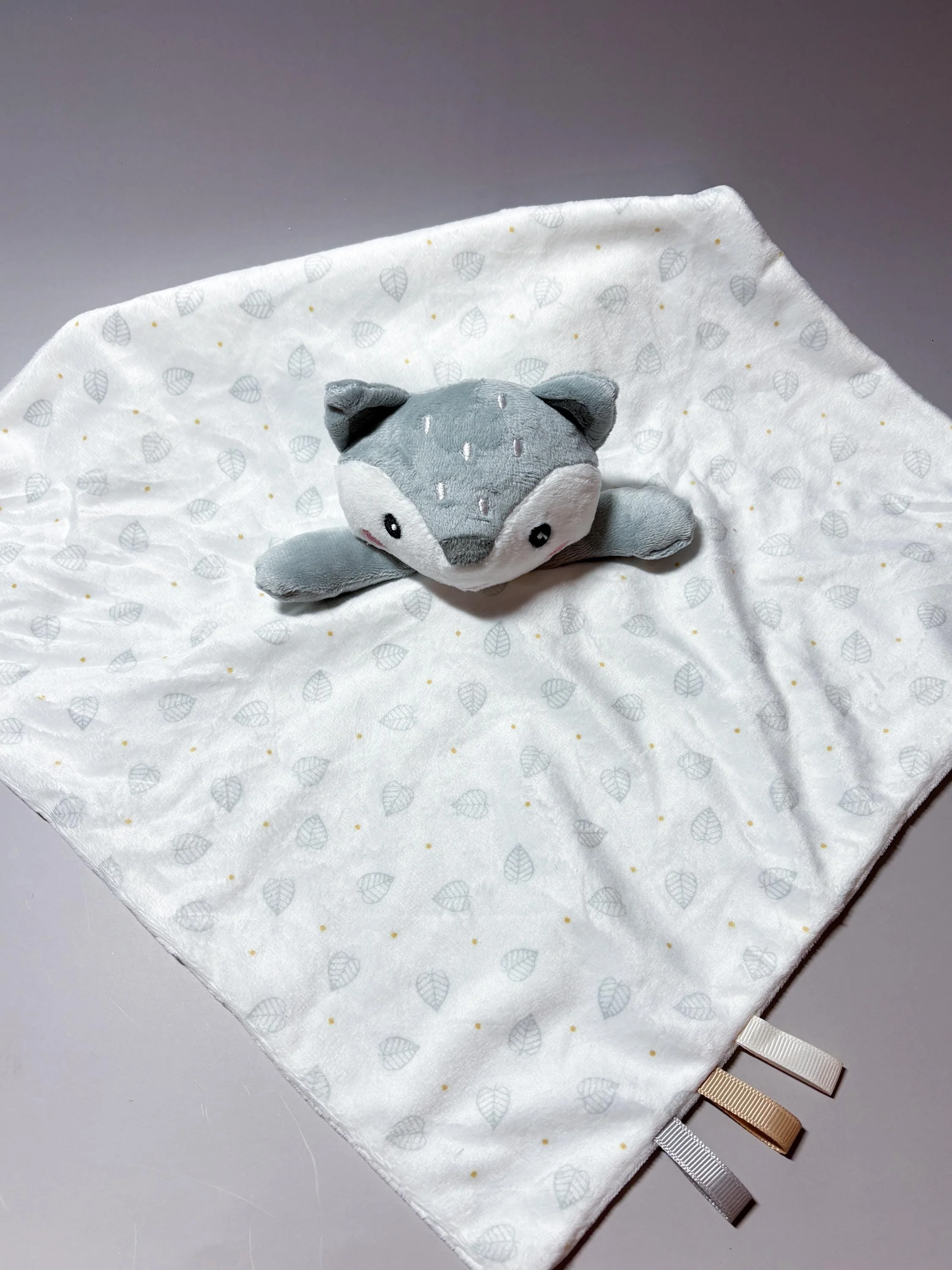 β’ Fox Lovey β features textured fabric and sensory ribbon tags along the edge
