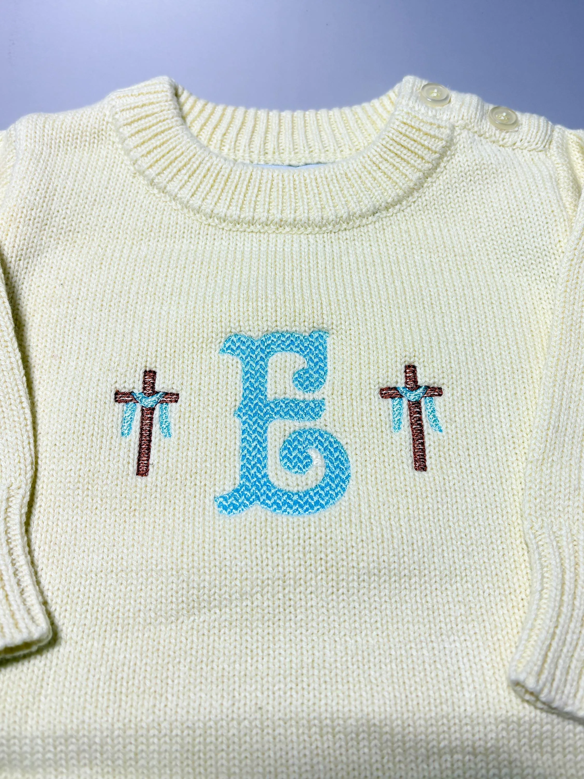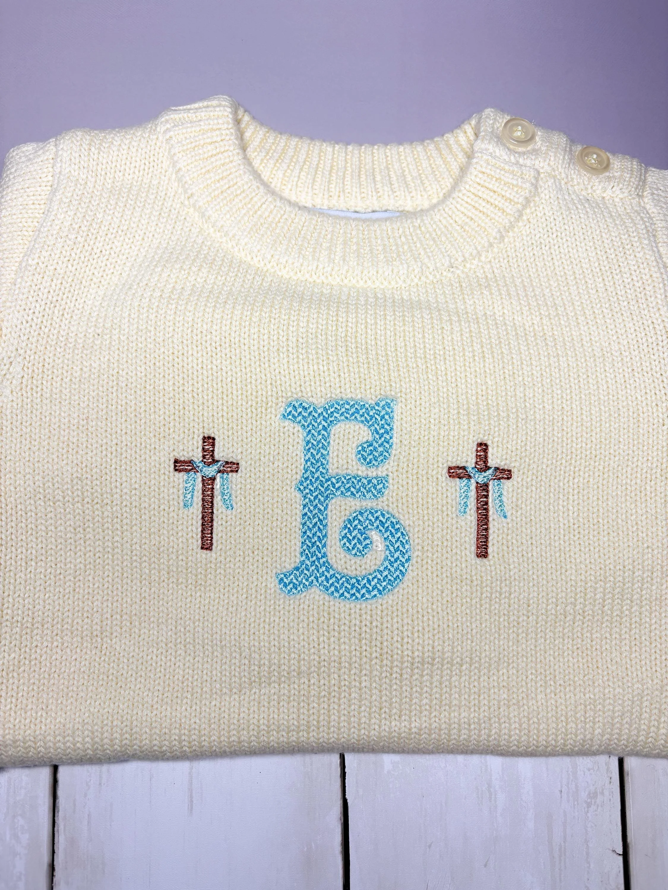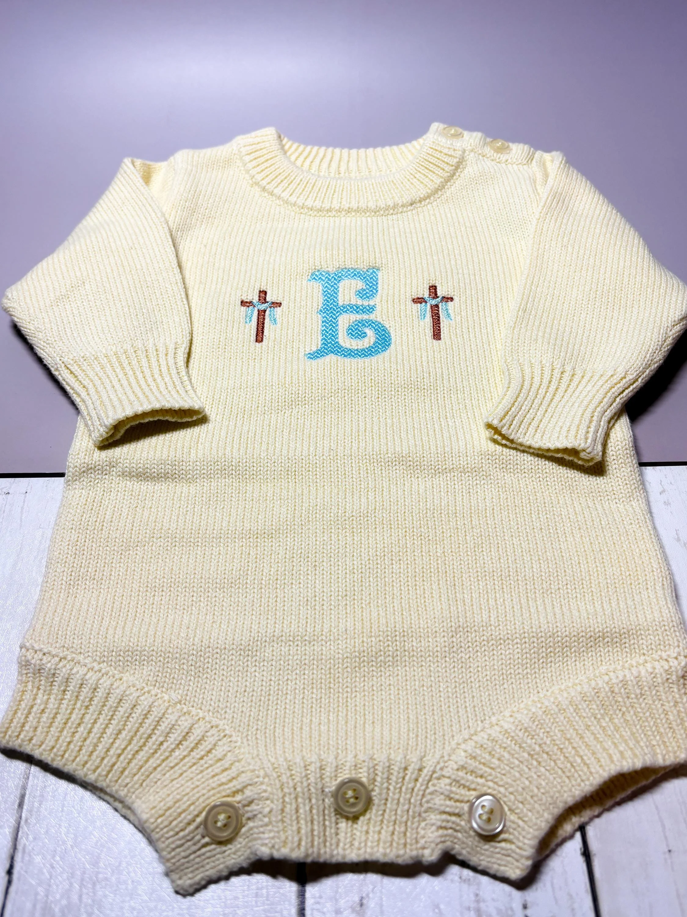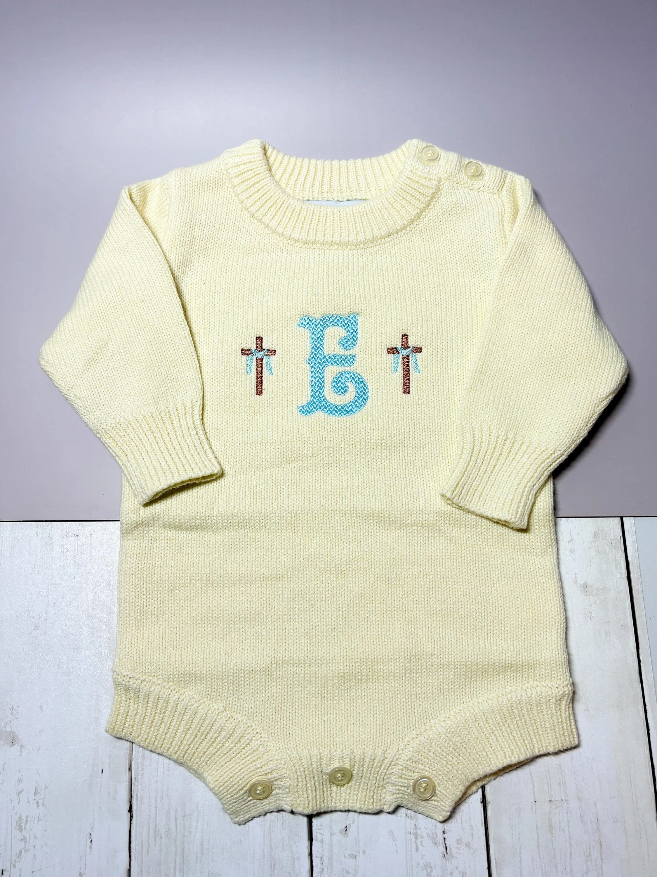 This knit Levi & Lane romper features a classic embroidered monogram framed by delicate crosses — the perfect Christian Easter outfit for your little one.