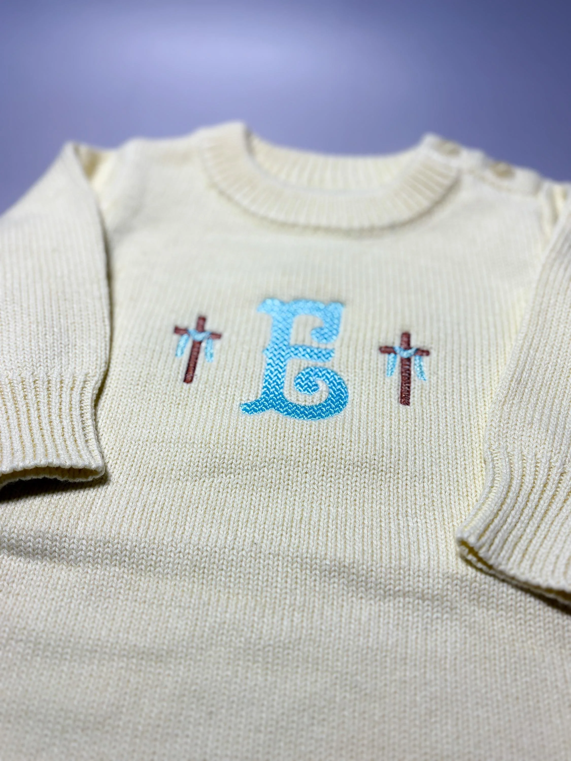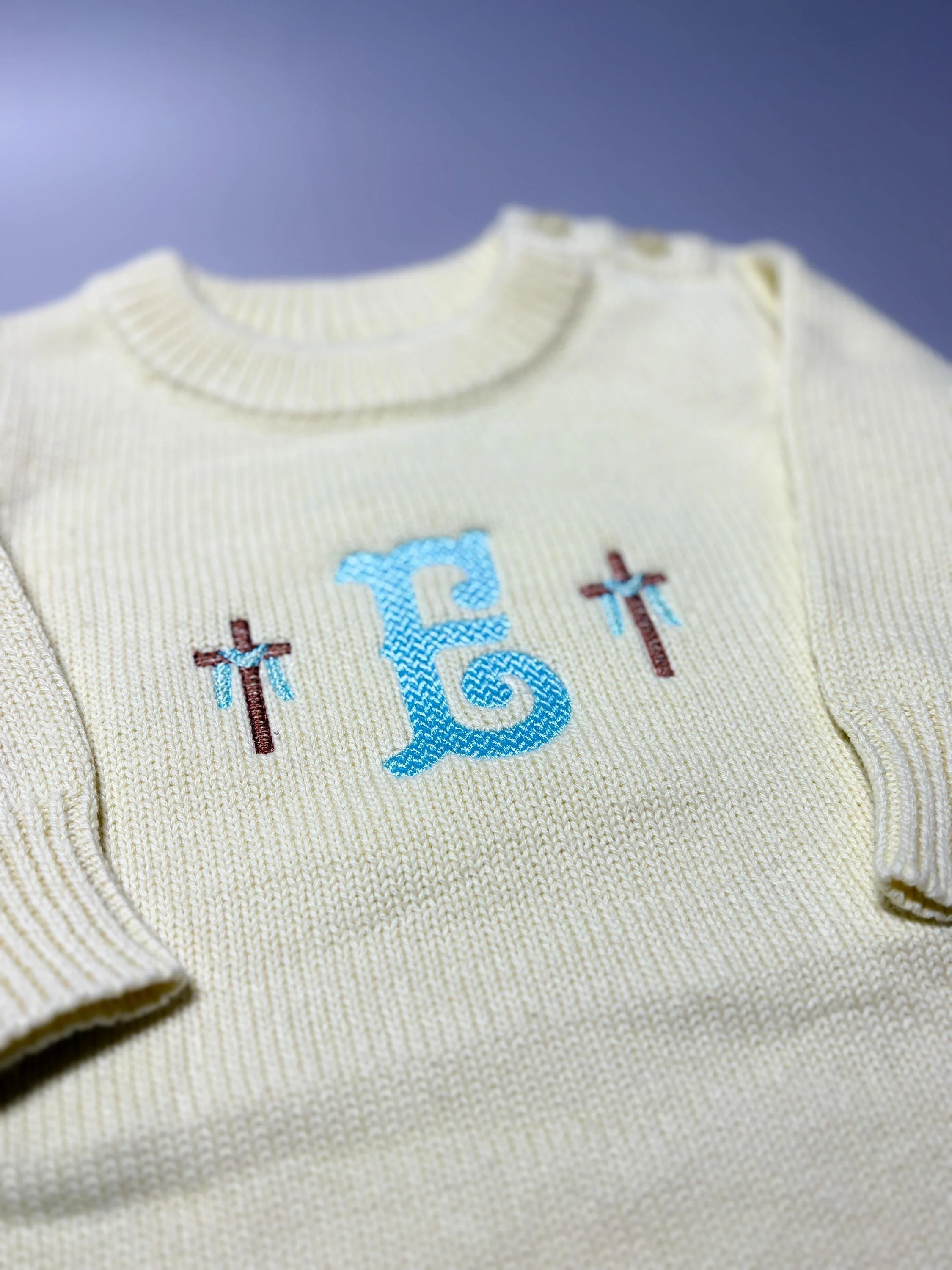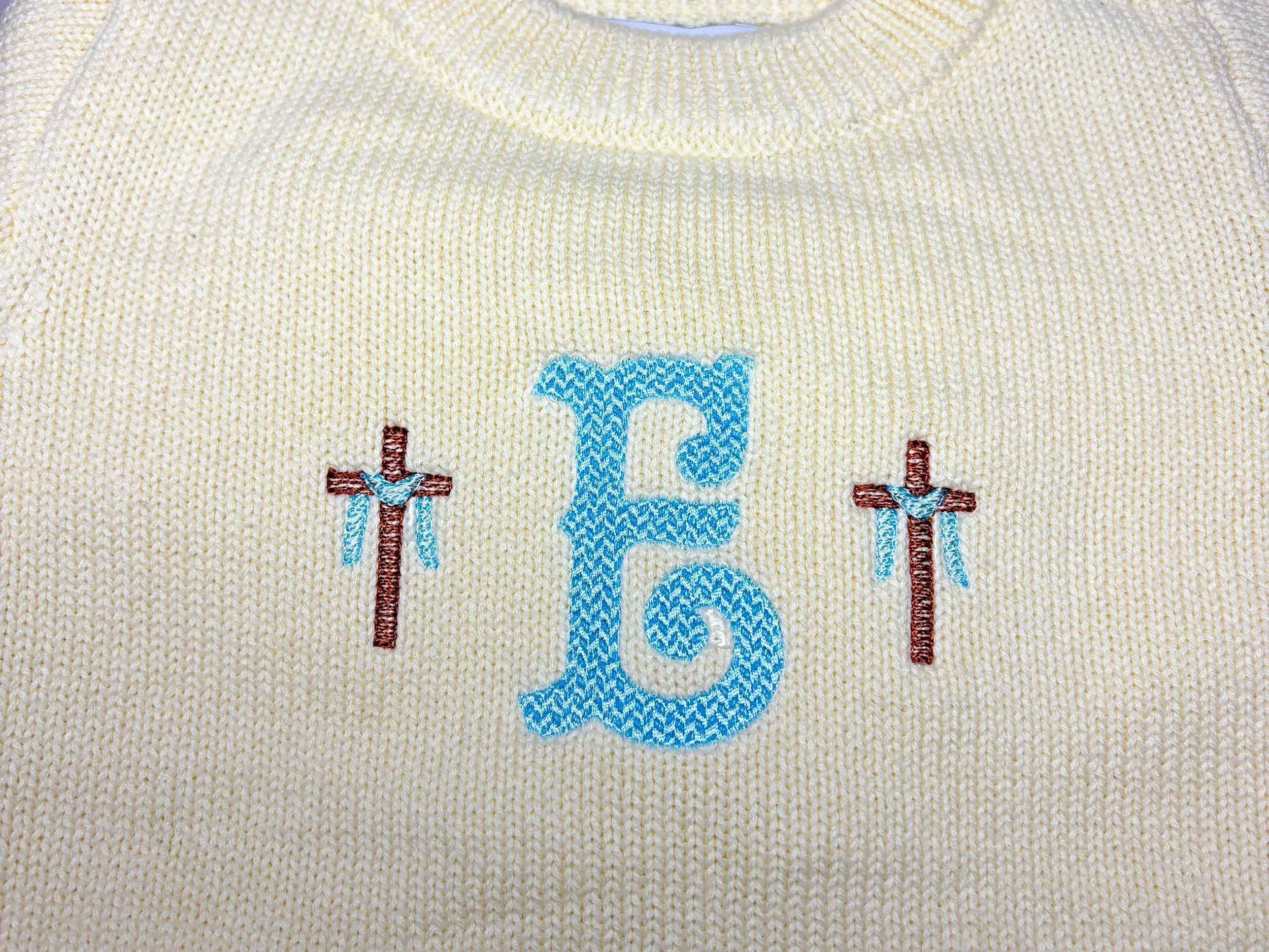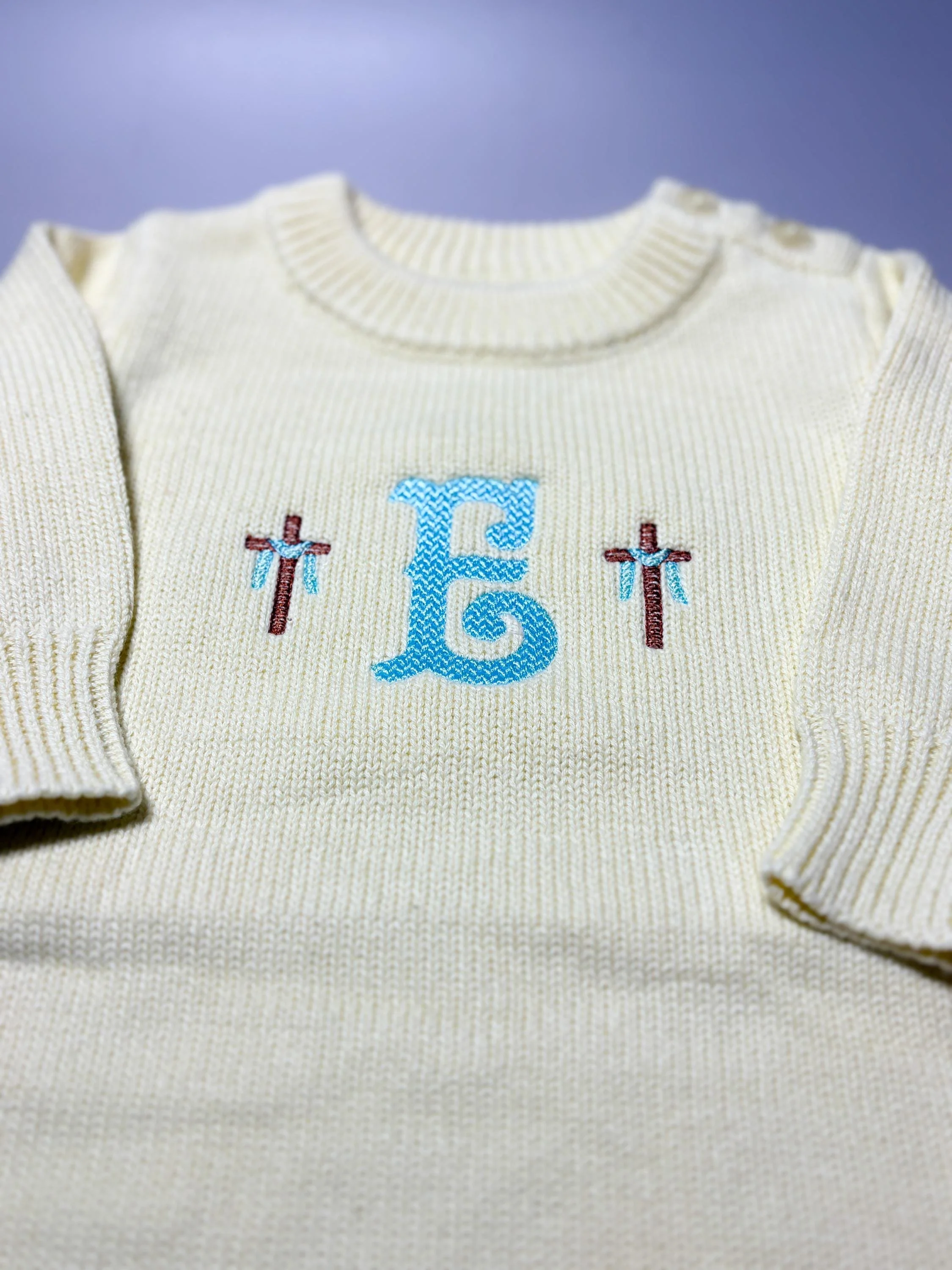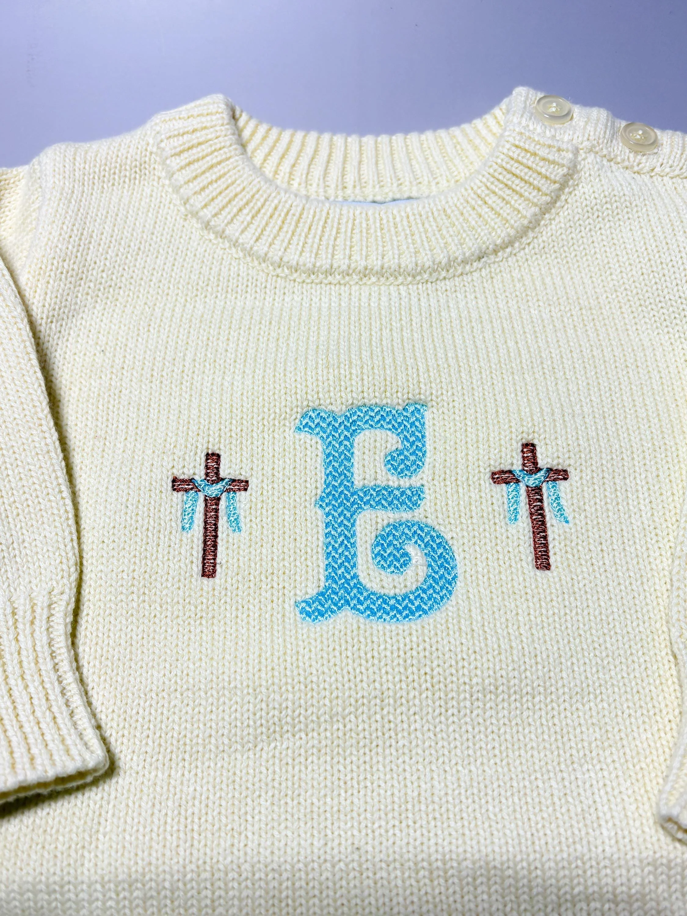 This knit Levi & Lane romper features a classic embroidered monogram framed by delicate crosses — the perfect Christian Easter outfit for your little one.