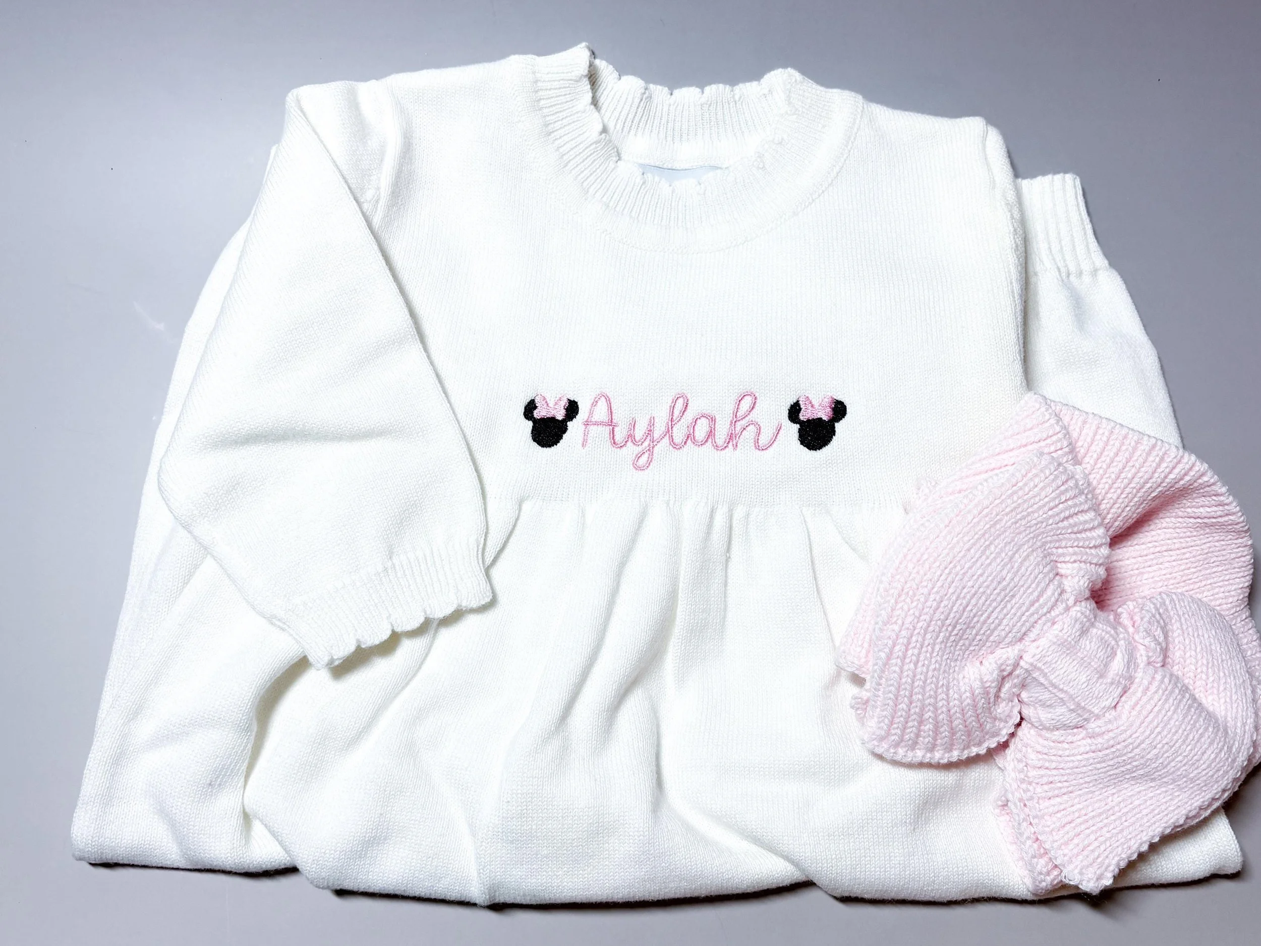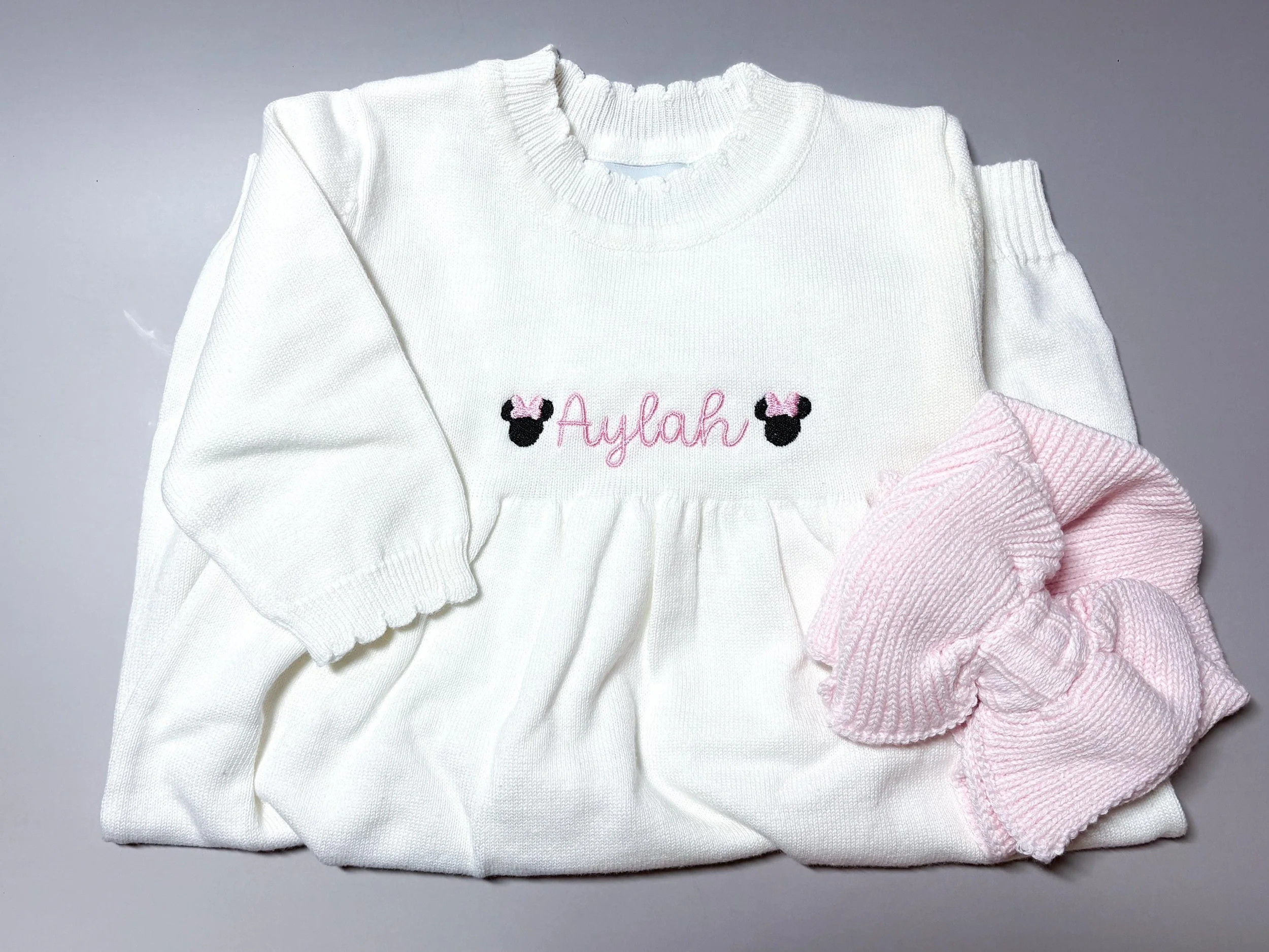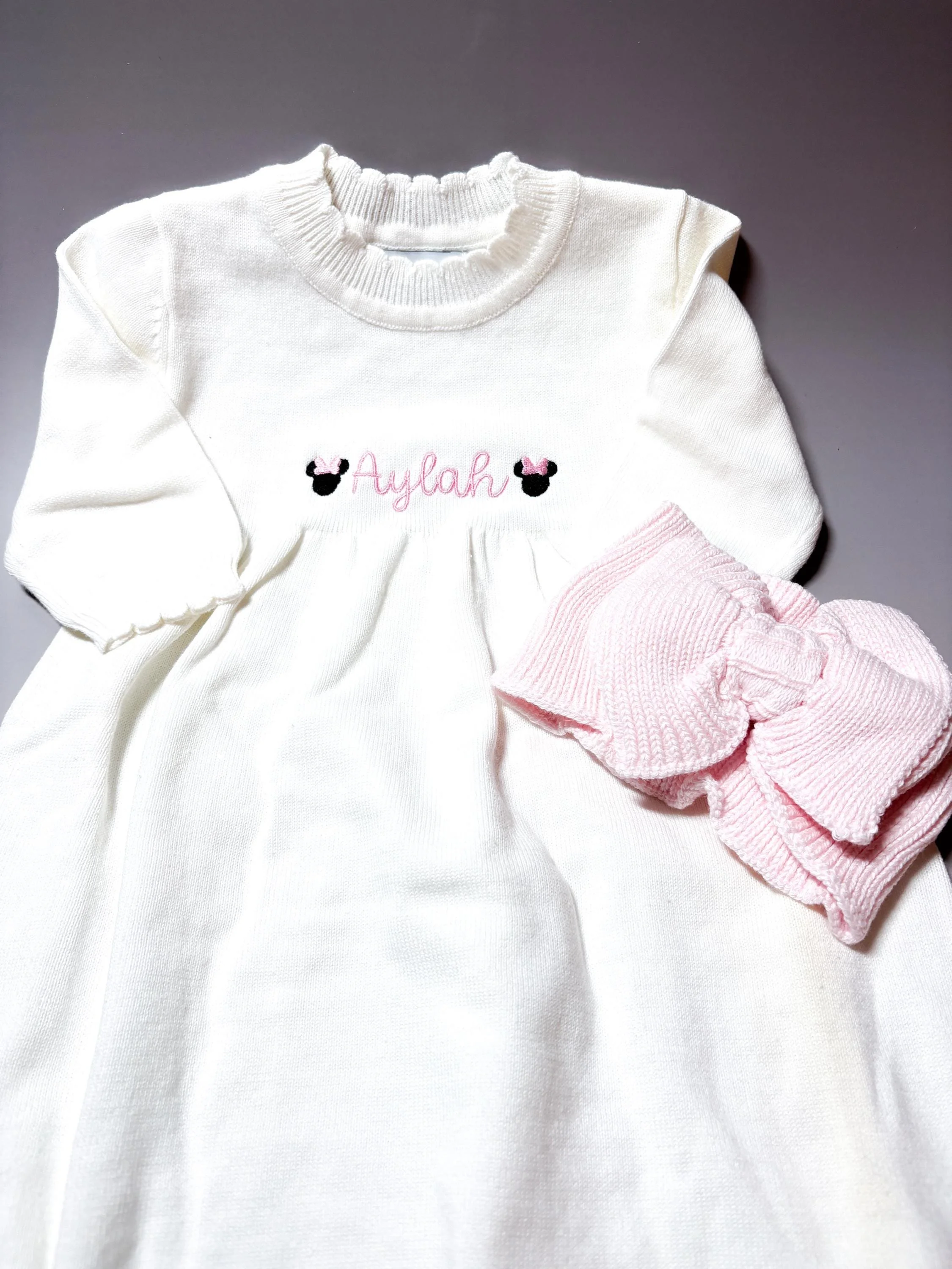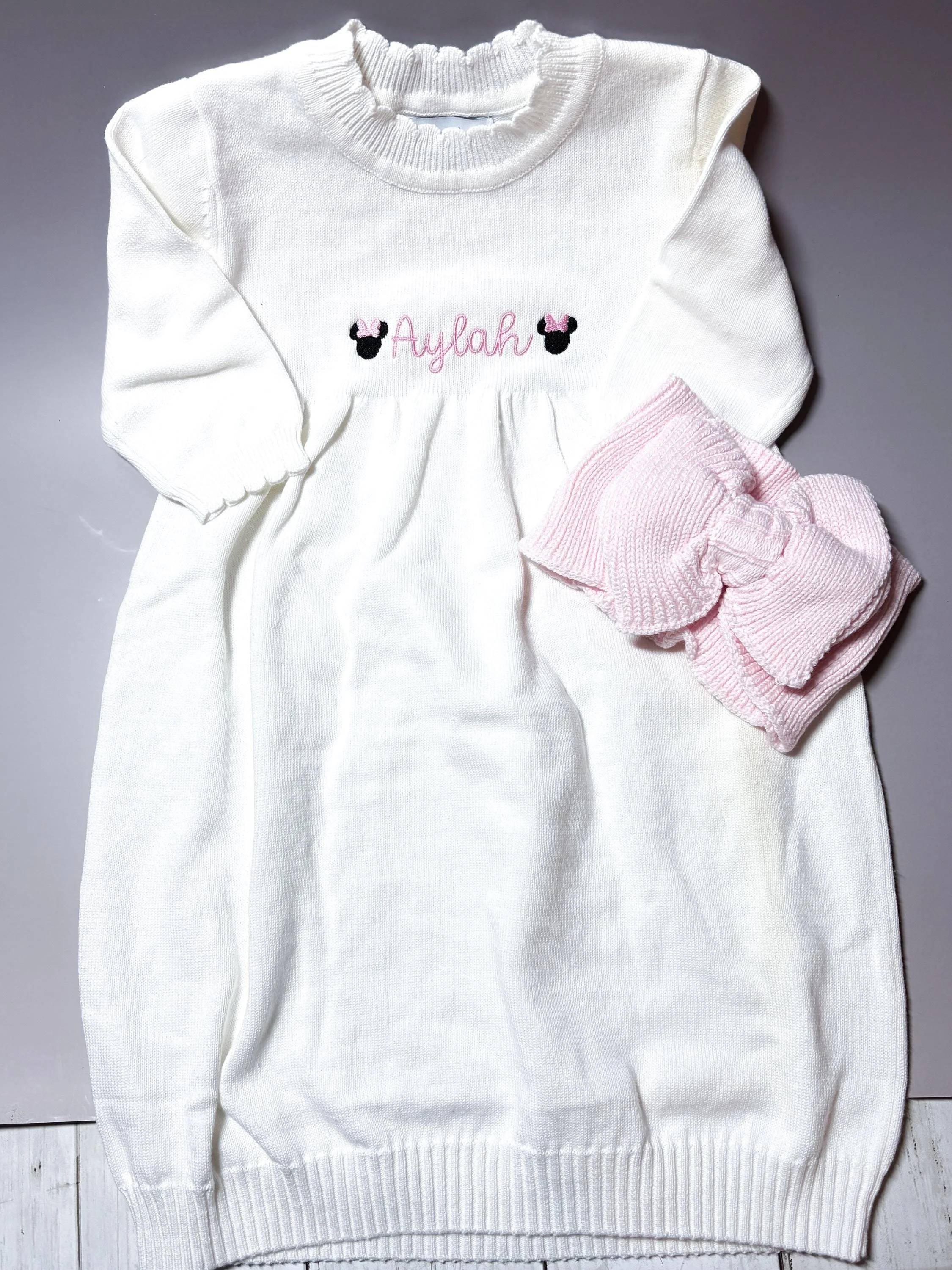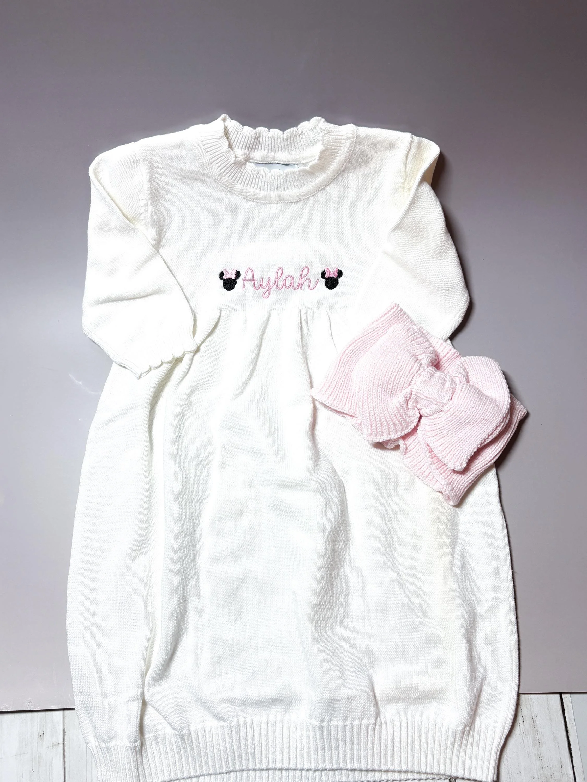 Personalized Newborn Gown Set | Custom Baby Name Outfit | Knit Baby Gown & Headband | Minnie Inspired Baby Outfit | Coming Home Outfit Girl