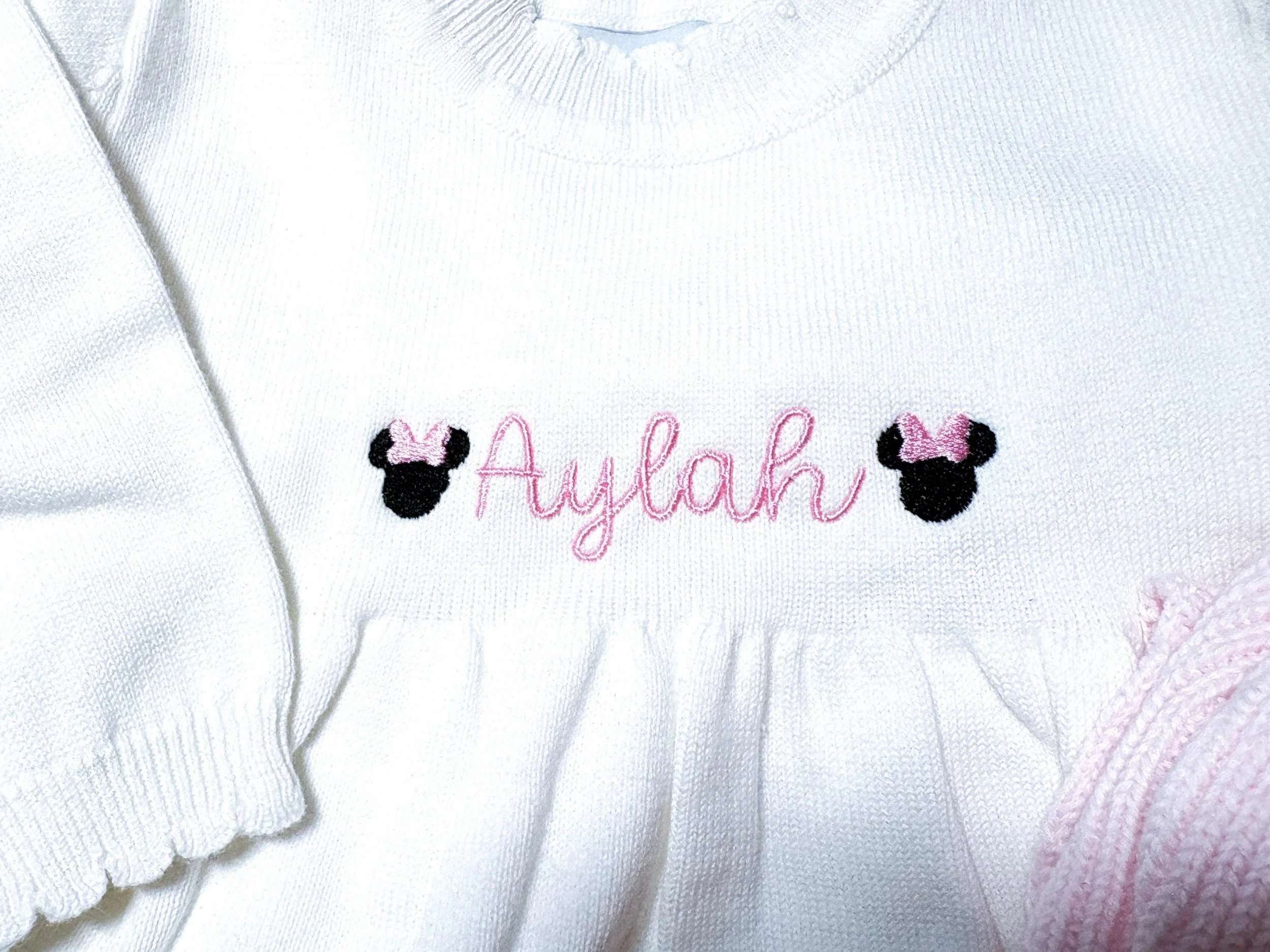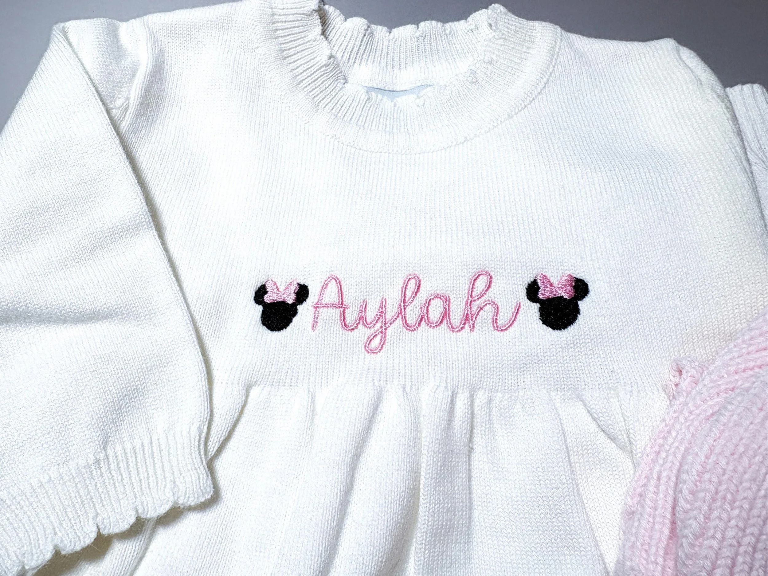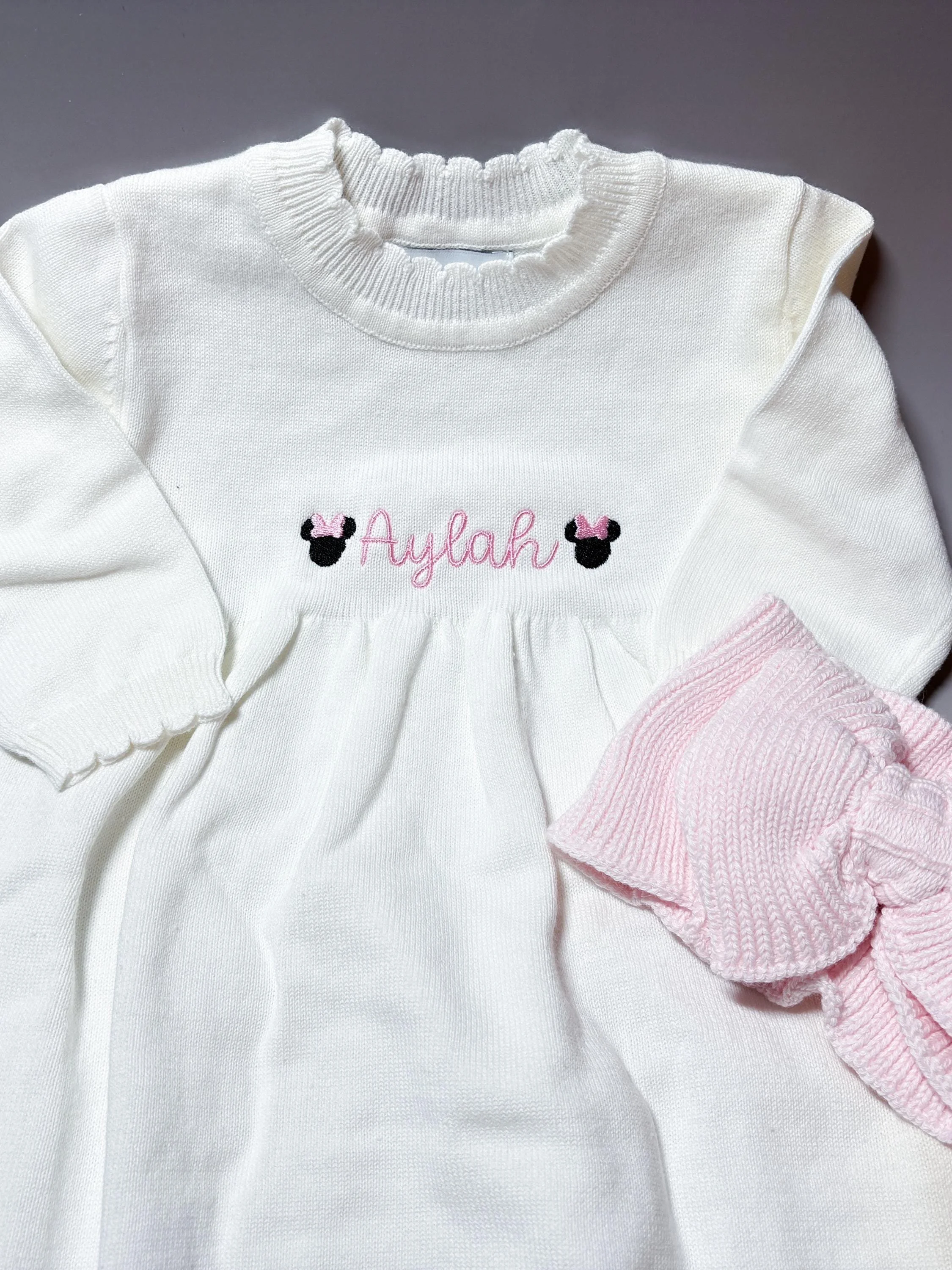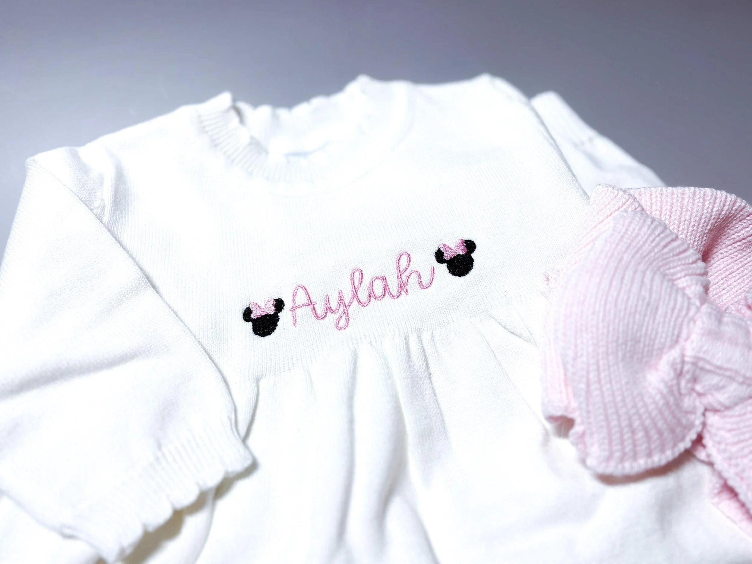 This boutique-style newborn gown set includes a soft knit gown paired with a matching headband, customized with your baby girlβs name and an adorable Minnie-inspired design. Perfect for those first photos, hospital moments, and coming home memories.