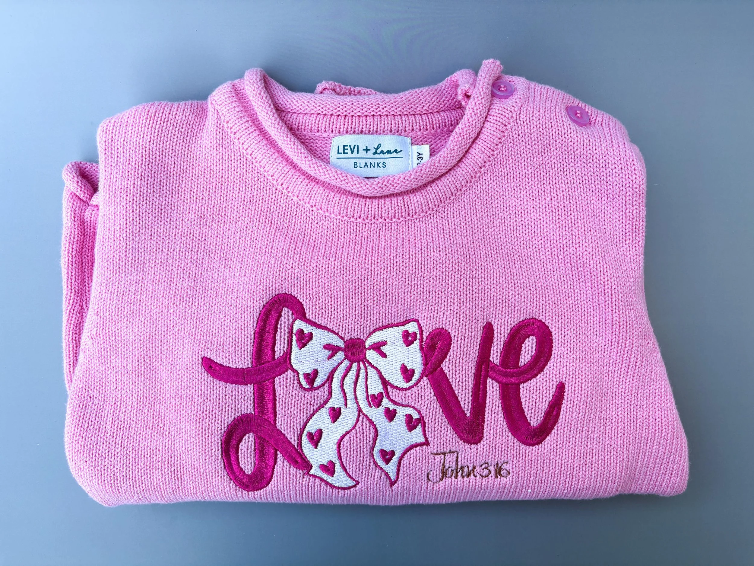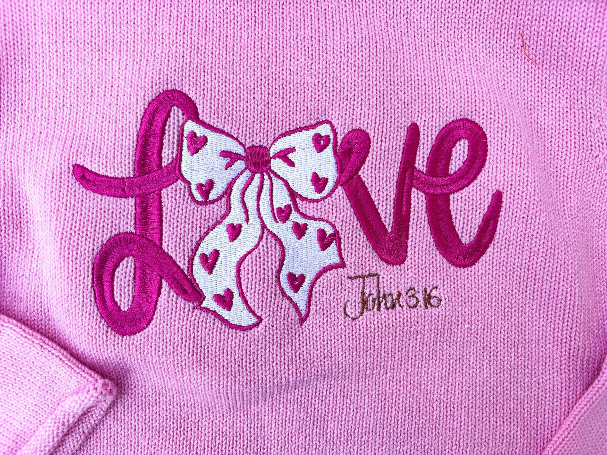 The embroidered design features the word βLoveβ accented by a heart bow, with John 3:16 stitched discreetly below β a gentle reminder of the greatest love of all.